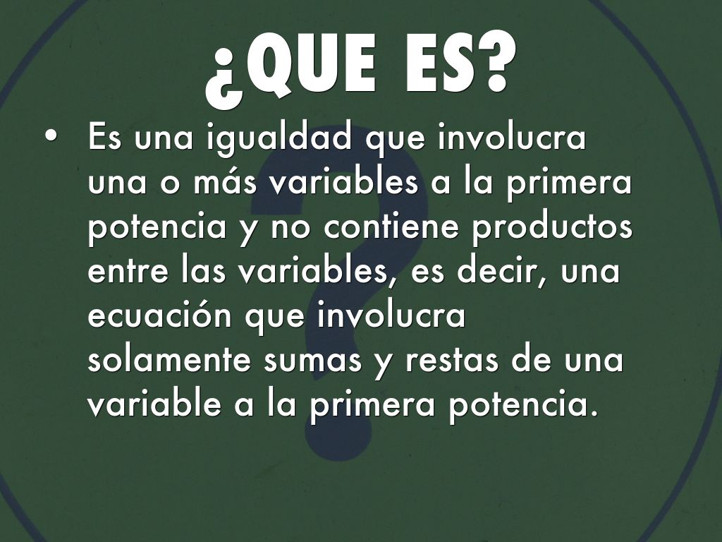 Es una igualdad que involucra una o más variables a la primera potencia y no contiene productos entre las variables, es decir, una ecuación que involucra solamente sumas y restas de una variable a la primera potencia.