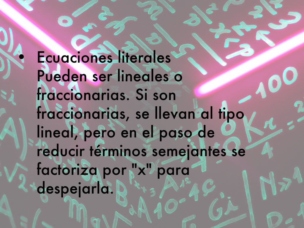 Pueden ser lineales o fraccionarias. Si son fraccionarias, se llevan al tipo lineal, pero en el paso de reducir términos semejantes se factoriza por "x" para despejarla.