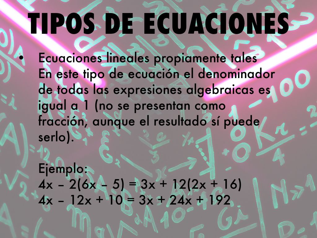 En este tipo de ecuación el denominador de todas las expresiones algebraicas es igual a 1 (no se presentan como fracción, aunque el resultado sí puede serlo).