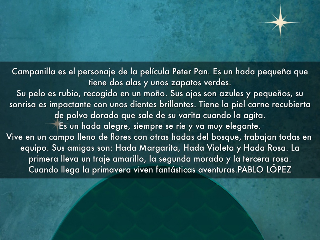 Campanilla es el personaje de la película Peter Pan. Es un hada pequeña que tiene dos alas y unos zapatos verdes. Su pelo es rubio, recogido en un moño. Sus ojos son azules y pequeños, su sonrisa es impactante con unos dientes brillantes. Tiene la piel carne recubierta de polvo dorado que sale de su varita cuando la agita. Es un hada alegre, siempre se ríe y va muy elegante. Vive en un campo lleno de flores con otras hadas del bosque, trabajan todas en equipo. Sus amigas son: Hada Margarita, Hada Violeta y Hada Rosa. La primera lleva un traje amarillo, la segunda morado y la tercera rosa. Cuando llega la primavera viven fantásticas aventuras.PABLO LÓPEZ