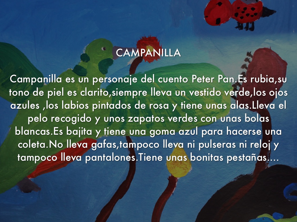 Campanilla es un personaje del cuento Peter Pan.Es rubia,su tono de piel es clarito,siempre lleva un vestido verde,los ojos azules ,los labios pintados de rosa y tiene unas alas.Lleva el pelo recogido y unos zapatos verdes con unas bolas blancas.Es bajita y tiene una goma azul para hacerse una coleta.No lleva gafas,tampoco lleva ni pulseras ni reloj y tampoco lleva pantalones.Tiene unas bonitas pestañas.