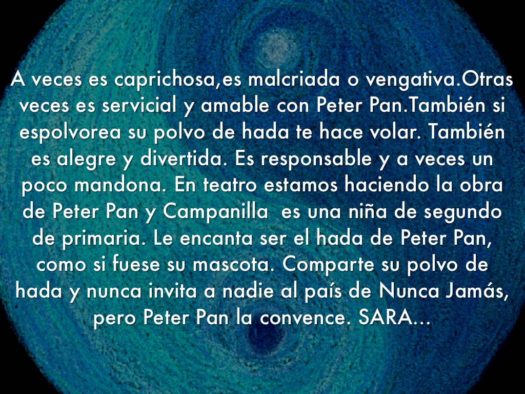A veces es caprichosa,es malcriada o vengativa.Otras veces es servicial y amable con Peter Pan.También si espolvorea su polvo de hada te hace volar. También es alegre y divertida. Es responsable y a veces un poco mandona. En teatro estamos haciendo la obra de Peter Pan y Campanilla es una niña de segundo de primaria. Le encanta ser el hada de Peter Pan, como si fuese su mascota. Comparte su polvo de hada y nunca invita a nadie al país de Nunca Jamás, pero Peter Pan la convence. SARA