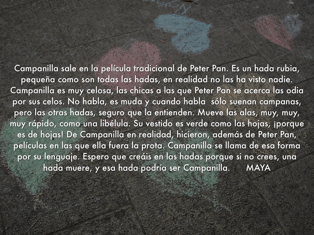Campanilla sale en la película tradicional de Peter Pan. Es un hada rubia, pequeña como son todas las hadas, en realidad no las ha visto nadie. Campanilla es muy celosa, las chicas a las que Peter Pan se acerca las odia por sus celos. No habla, es muda y cuando habla sólo suenan campanas, pero las otras hadas, seguro que la entienden. Mueve las alas, muy, muy, muy rápido, como una libélula. Su vestido es verde como las hojas, ¡porque es de hojas! De Campanilla en realidad, hicieron, además de Peter Pan, películas en las que ella fuera la prota. Campanilla se llama de esa forma por su lenguaje. Espero que creáis en las hadas porque si no crees, una hada muere, y esa hada podría ser Campanilla. MAYA