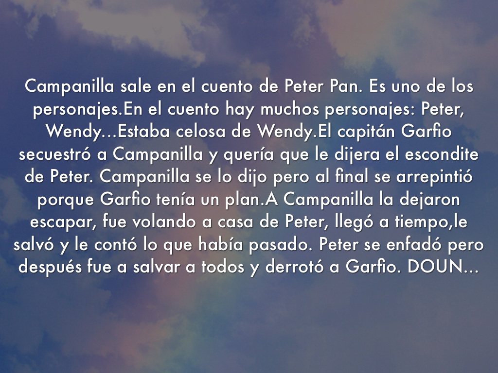 Campanilla sale en el cuento de Peter Pan. Es uno de los personajes.En el cuento hay muchos personajes: Peter, Wendy...Estaba celosa de Wendy.El capitán Garfio secuestró a Campanilla y quería que le dijera el escondite de Peter. Campanilla se lo dijo pero al final se arrepintió porque Garfio tenía un plan.A Campanilla la dejaron escapar, fue volando a casa de Peter, llegó a tiempo,le salvó y le contó lo que había pasado. Peter se enfadó pero después fue a salvar a todos y derrotó a Garfio. DOUNIA
