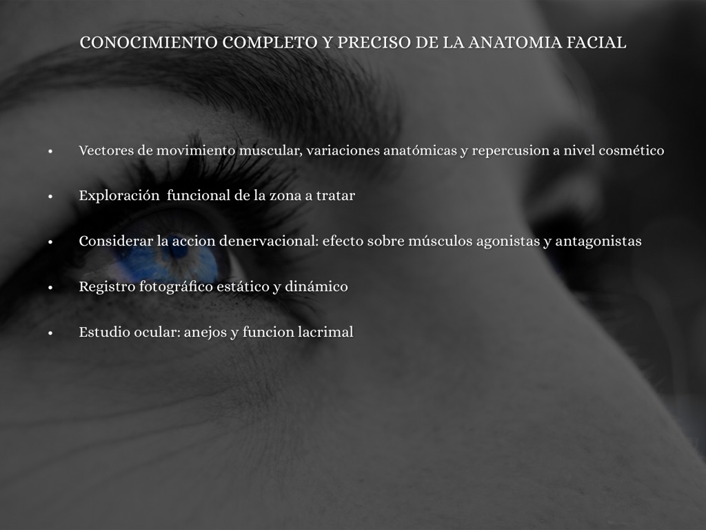 • Arrugas hiperdinámicas: frente, glabela y patas de gallo