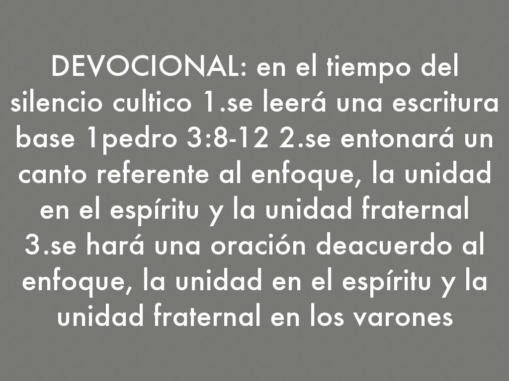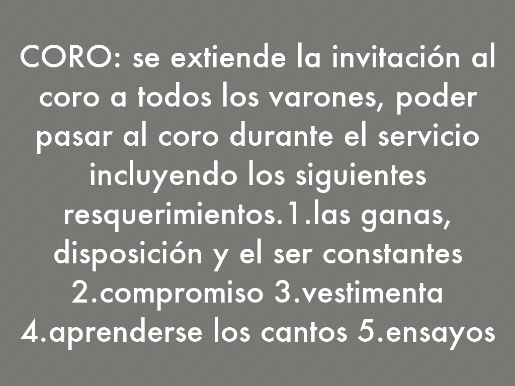 CORO: se extiende la invitación al coro a todos los varones, poder pasar al coro durante el servicio incluyendo los siguientes resquerimientos.1.las ganas, disposición y el ser constantes 2.compromiso 3.vestimenta 4.aprenderse los cantos 5.ensayos