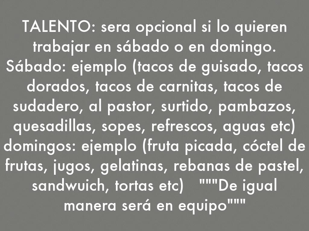 TALENTO: sera opcional si lo quieren trabajar en sábado o en domingo. Sábado: ejemplo (tacos de guisado, tacos dorados, tacos de carnitas, tacos de sudadero, al pastor, surtido, pambazos, quesadillas, sopes, refrescos, aguas etc) domingos: ejemplo (fruta picada, cóctel de frutas, jugos, gelatinas, rebanas de pastel, sandwuich, tortas etc) """De igual manera será en equipo"""