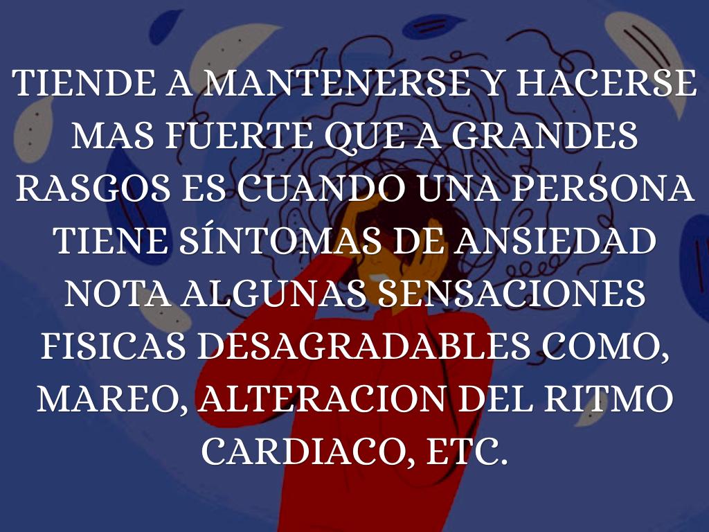 TIENDE A MANTENERSE Y HACERSE MAS FUERTE QUE A GRANDES RASGOS ES CUANDO UNA PERSONA TIENE SÍNTOMAS DE ANSIEDAD NOTA ALGUNAS SENSACIONES FISICAS DESAGRADABLES COMO, MAREO, ALTERACION DEL RITMO CARDIACO, ETC.