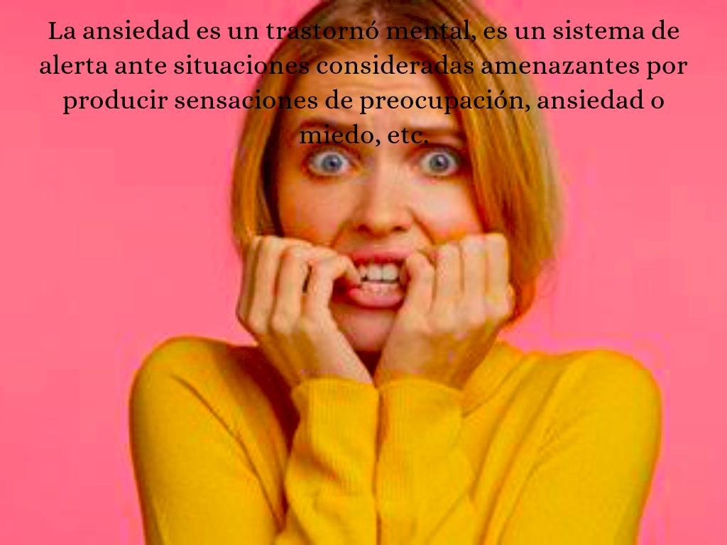 La ansiedad es un trastornó mental, es un sistema de alerta ante situaciones consideradas amenazantes por producir sensaciones de preocupación, ansiedad o miedo, etc.