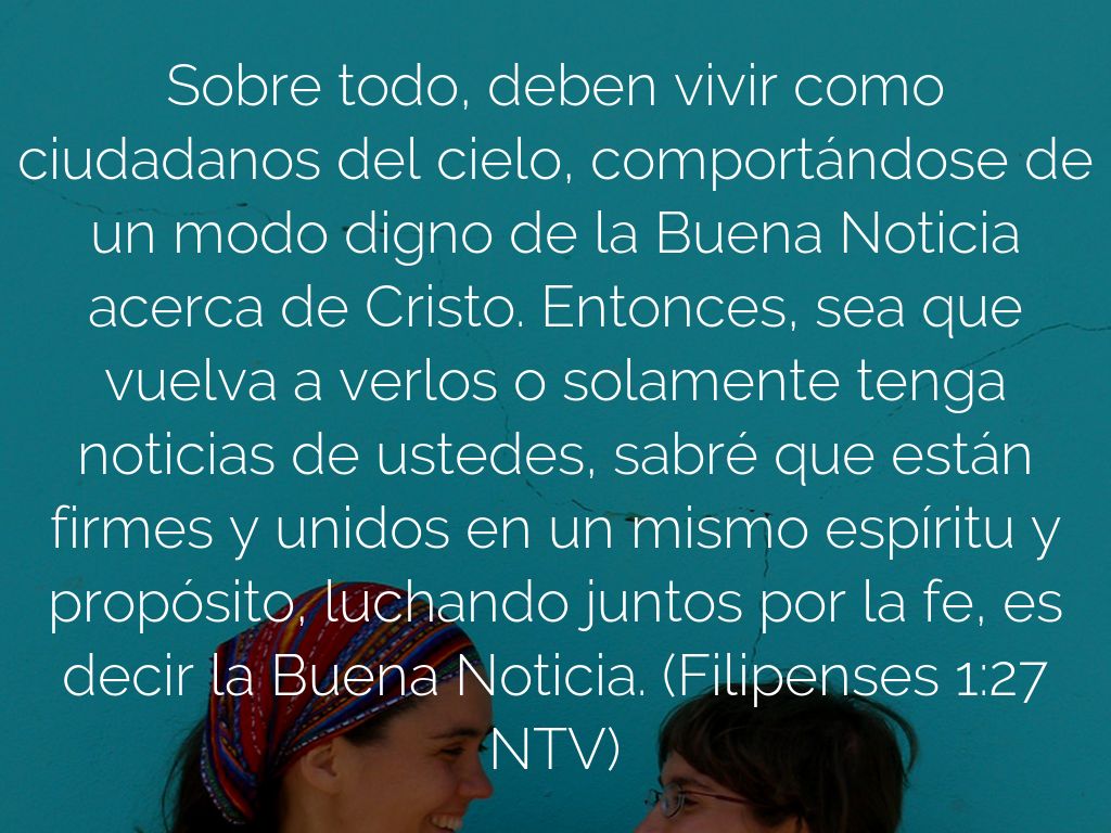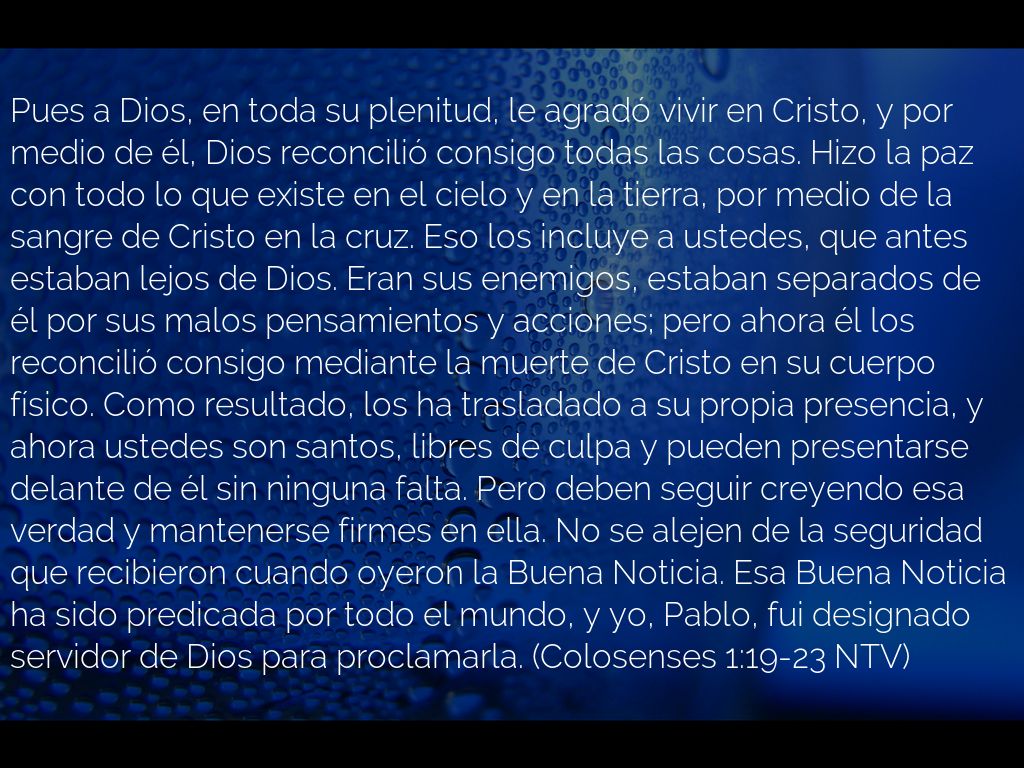 Pues a Dios, en toda su plenitud, le agradó vivir en Cristo, y por medio de él, Dios reconcilió consigo todas las cosas. Hizo la paz con todo lo que existe en el cielo y en la tierra, por medio de la sangre de Cristo en la cruz. Eso los incluye a ustedes, que antes estaban lejos de Dios. Eran sus enemigos, estaban separados de él por sus malos pensamientos y acciones; pero ahora él los reconcilió consigo mediante la muerte de Cristo en su cuerpo físico. Como resultado, los ha trasladado a su propia presencia, y ahora ustedes son santos, libres de culpa y pueden presentarse delante de él sin ninguna falta. Pero deben seguir creyendo esa verdad y mantenerse firmes en ella. No se alejen de la seguridad que recibieron cuando oyeron la Buena Noticia. Esa Buena Noticia ha sido predicada por todo el mundo, y yo, Pablo, fui designado servidor de Dios para proclamarla. (Colosenses 1:19-23 NTV)