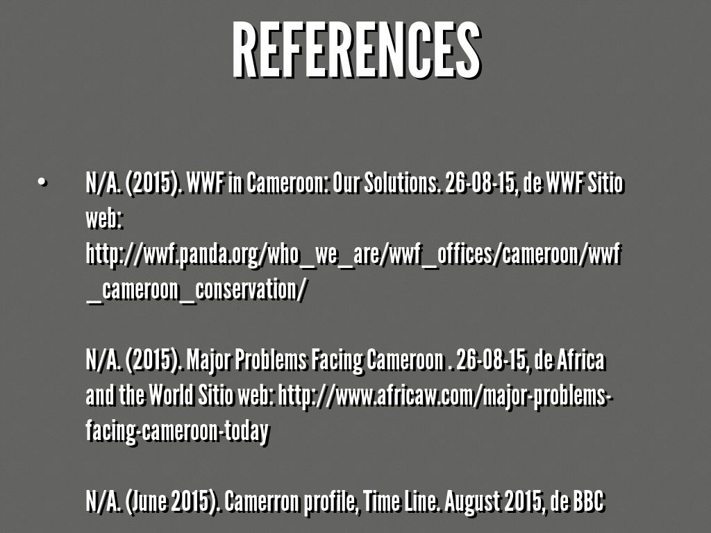 N/A. (2015). Major Problems Facing Cameroon . 26-08-15, de Africa and the World Sitio web: