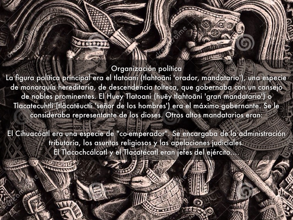 La figura política principal era el tlatoani (tlahtoāni 'orador, mandatario'), una especie de monarquía hereditaria, de descendencia tolteca, que gobernaba con un consejo de nobles prominentes. El Huey Tlatoani (huēy tlahtoāni 'gran mandatario') o Tlacatecuhtli (tlācatēuctli 'señor de los hombres') era el máximo gobernante. Se le consideraba representante de los dioses. Otros altos mandatarios eran:
