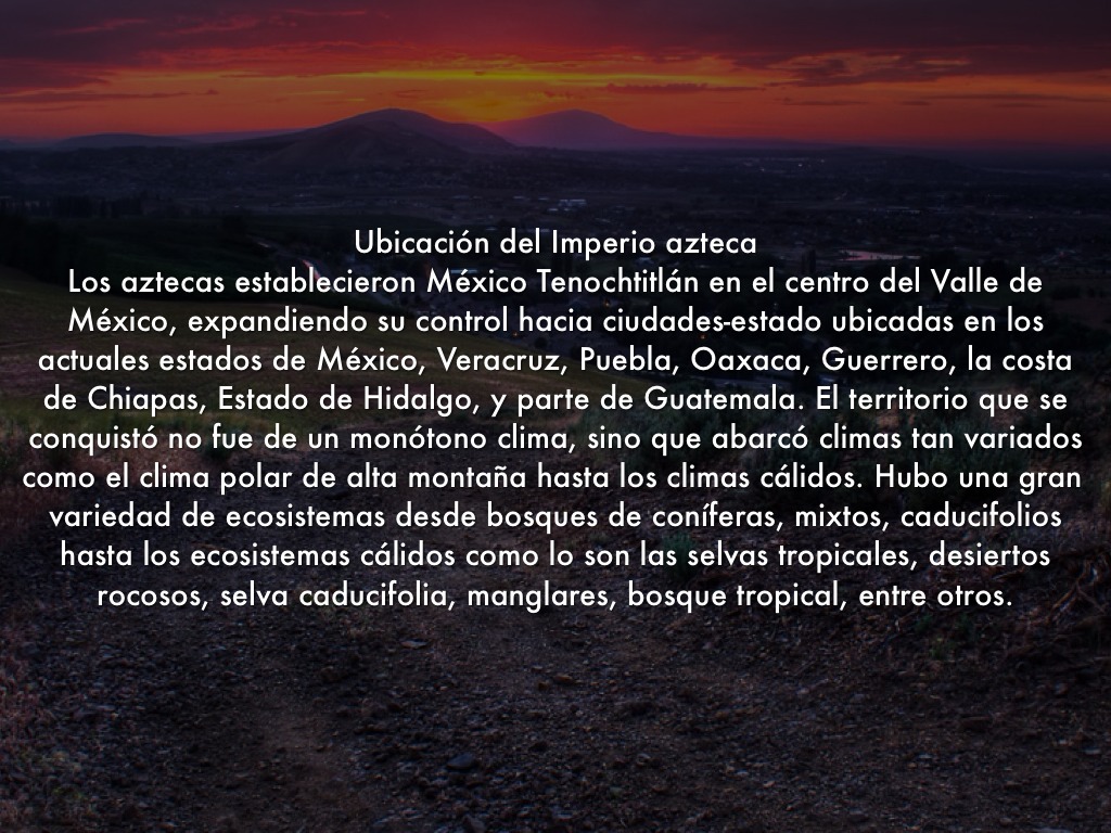 Los aztecas establecieron México Tenochtitlán en el centro del Valle de México, expandiendo su control hacia ciudades-estado ubicadas en los actuales estados de México, Veracruz, Puebla, Oaxaca, Guerrero, la costa de Chiapas, Estado de Hidalgo, y parte de Guatemala. El territorio que se conquistó no fue de un monótono clima, sino que abarcó climas tan variados como el clima polar de alta montaña hasta los climas cálidos. Hubo una gran variedad de ecosistemas desde bosques de coníferas, mixtos, caducifolios hasta los ecosistemas cálidos como lo son las selvas tropicales, desiertos rocosos, selva caducifolia, manglares, bosque tropical, entre otros.