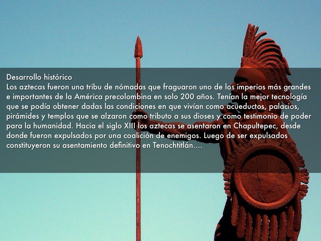 Los aztecas fueron una tribu de nómadas que fraguaron uno de los imperios más grandes e importantes de la América precolombina en solo 200 años. Tenían la mejor tecnología que se podía obtener dadas las condiciones en que vivían como acueductos, palacios, pirámides y templos que se alzaron como tributo a sus dioses y como testimonio de poder para la humanidad. Hacia el siglo XIII los aztecas se asentaron en Chapultepec, desde donde fueron expulsados por una coalición de enemigos. Luego de ser expulsados constituyeron su asentamiento definitivo en Tenochtitlán.
