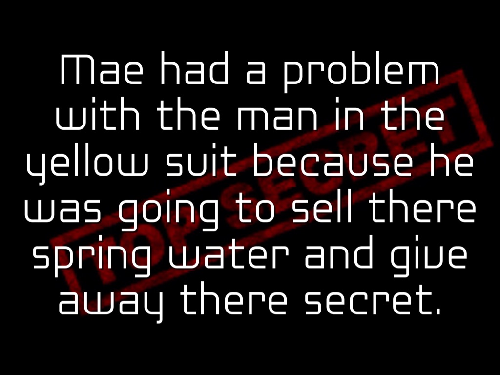 Mae had a problem with the man in the yellow suit because he was going to sell there spring water and give away there secret.