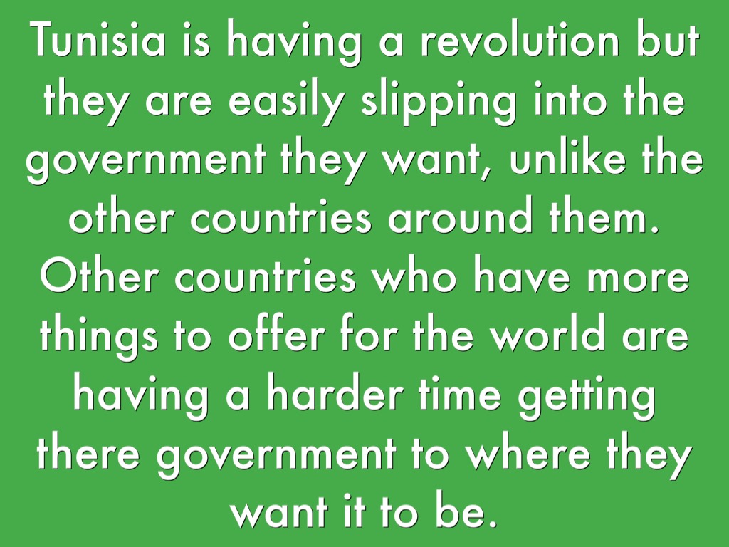 Tunisia is having a revolution but they are easily slipping into the government they want, unlike the other countries around them. Other countries who have more things to offer for the world are having a harder time getting there government to where they want it to be.