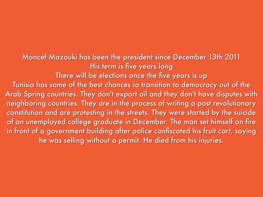 Tunisia has some of the best chances to transition to democracy out of the Arab Spring countries. They don't export oil and they don't have disputes with neighboring countries. They are in the process of writing a post revolutionary constitution and are protesting in the streets. They were started by the suicide of an unemployed college graduate in December. The man set himself on fire in front of a government building after police confiscated his fruit cart, saying he was selling without a permit. He died from his injuries.
