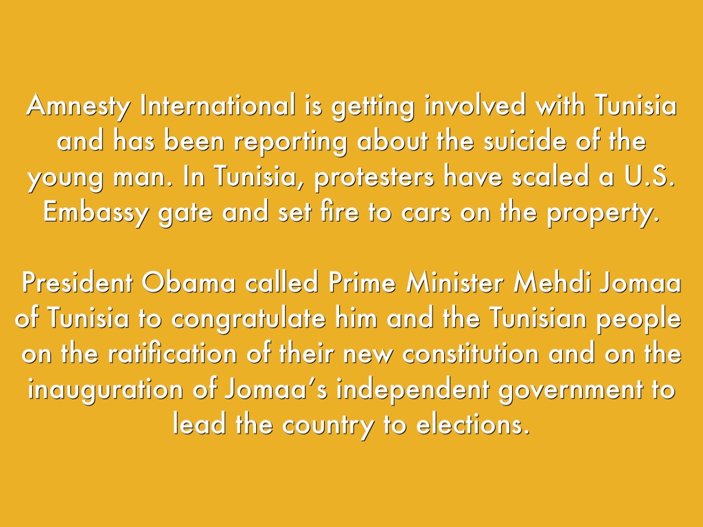 Amnesty International is getting involved with Tunisia and has been reporting about the suicide of the young man. In Tunisia, protesters have scaled a U.S. Embassy gate and set fire to cars on the property.