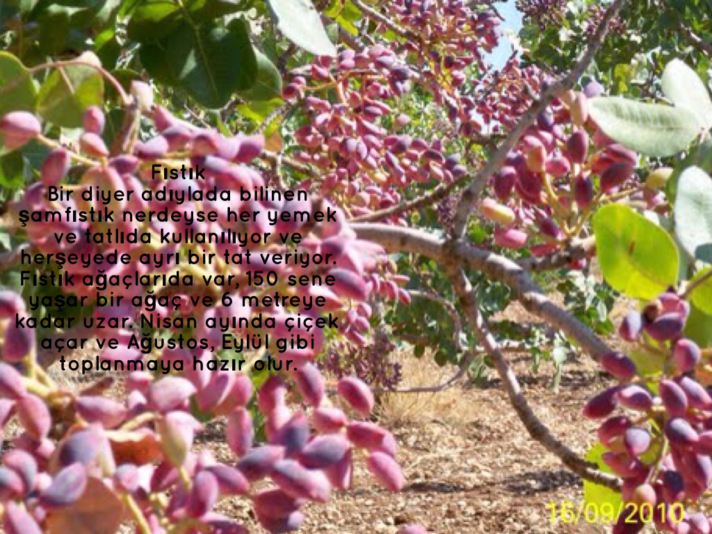 Fıstık ağaçlarıda var, 150 sene yaşar bir ağaç ve 6 metreye kadar uzar. Nisan ayında çiçek açar ve Ağustos, Eylül gibi toplanmaya hazır olur.