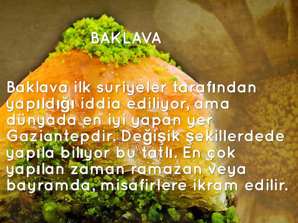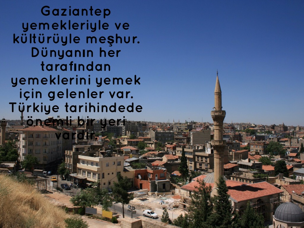 Gaziantep'in yemekleride çok meşhur türkiyenin hatta dünyanın en güzel yemekleri orda vardır. Baklavasından, lahmacununu, kunefesınden,kadayıfına daha fazla vardır.