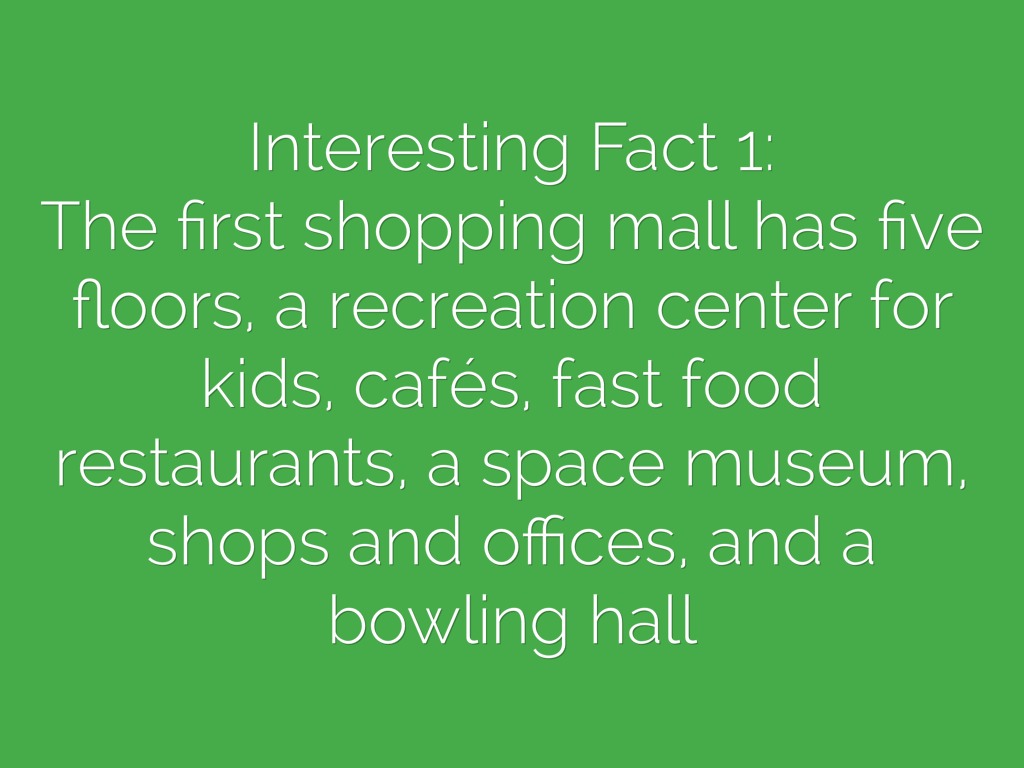 Interesting Fact 1: The first shopping mall has five floors, a recreation center for kids, cafés, fast food restaurants, a space museum, shops and offices, and a bowling hall