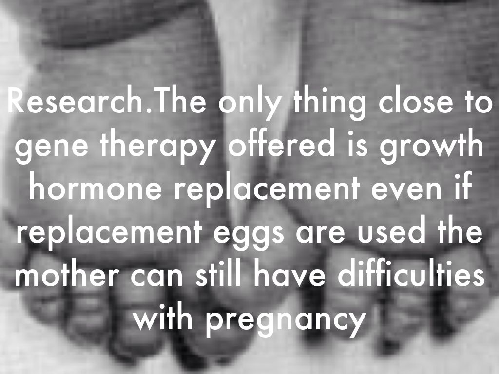 Research.The only thing close to gene therapy offered is growth hormone replacement even if replacement eggs are used the mother can still have difficulties with pregnancy