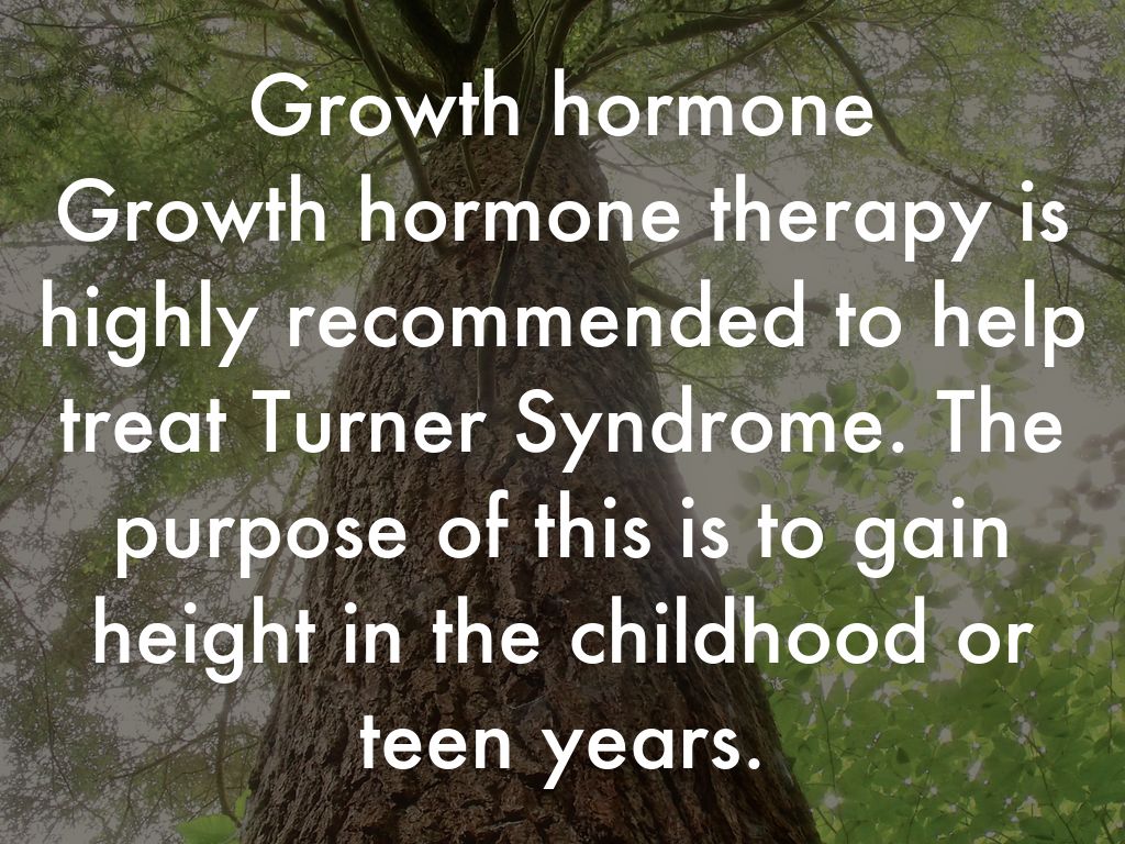 Growth hormone Growth hormone therapy is highly recommended to help treat Turner Syndrome. The purpose of this is to gain height in the childhood or teen years.