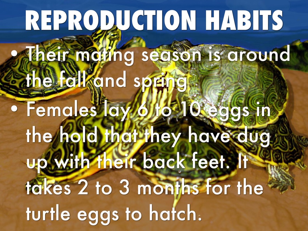 Females lay 6 to 10 eggs in the hold that they have dug up with their back feet. It takes 2 to 3 months for the turtle eggs to hatch.