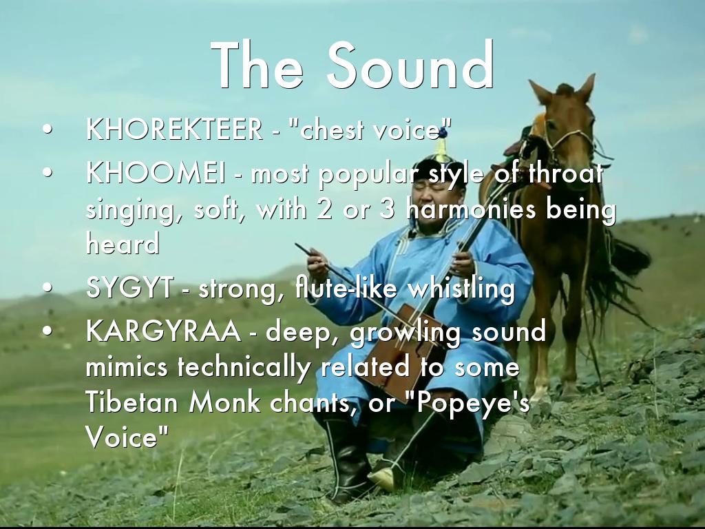 - KHOOMEI - most popular style of throat singing, soft, with 2 or 3 harmonies being heard