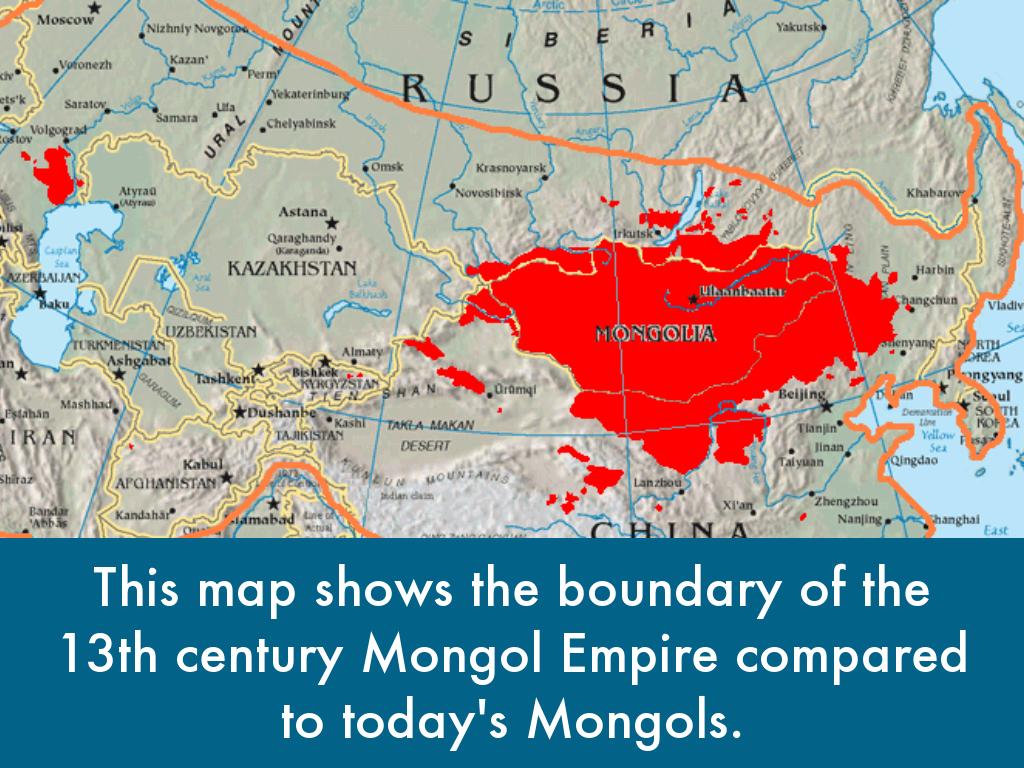 This map shows the boundary of the 13th century Mongol Empire compared to today's Mongols.