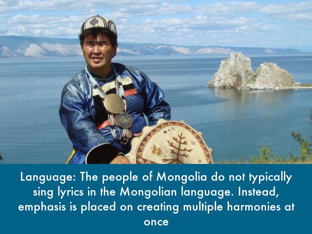 Language: The people of Mongolia do not typically sing lyrics in the Mongolian language. Instead, emphasis is placed on creating multiple harmonies at once