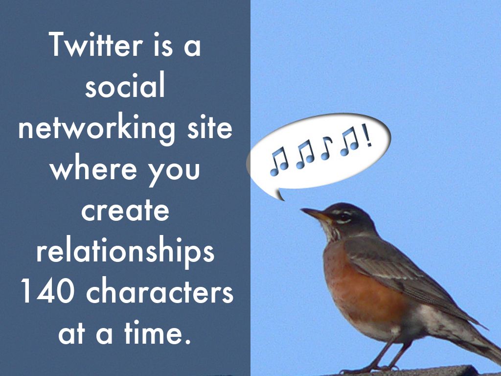 Twitter is a social networking site where you create relationships 140 characters at a time.