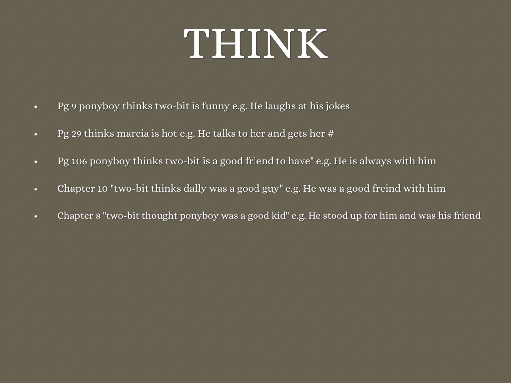 Pg 106 ponyboy thinks two-bit is a good friend to have" e.g. He is always with him