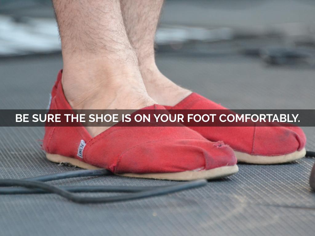 BE SURE THE SHOE IS ON YOUR FOOT COMFORTABLY.
