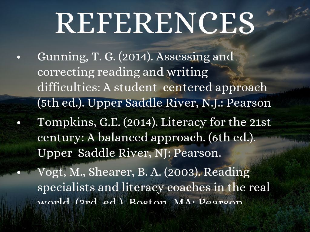 Tompkins, G.E. (2014). Literacy for the 21st century: A balanced approach. (6th ed.). Upper Saddle River, NJ: Pearson.
