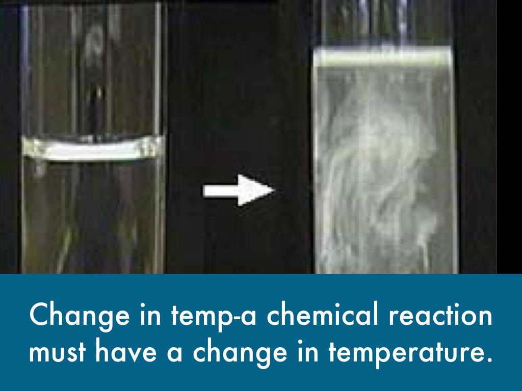 Change in temp-a chemical reaction must have a change in temperature.