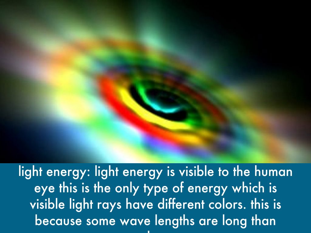light energy: light energy is visible to the human eye this is the only type of energy which is visible light rays have different colors. this is because some wave lengths are long than others.