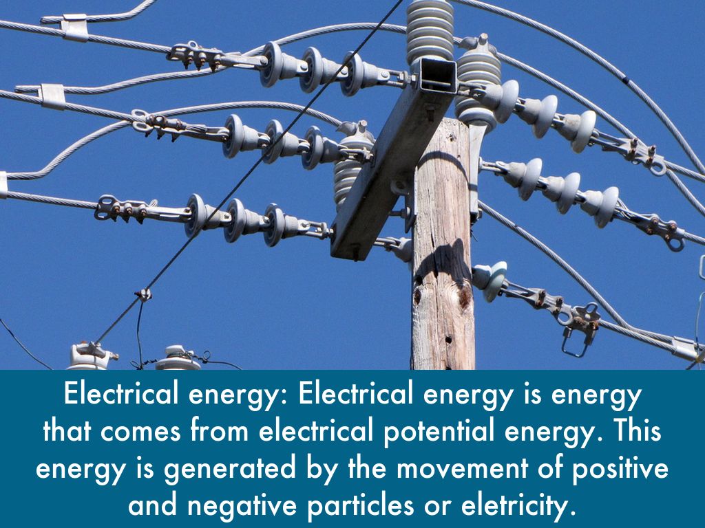 Electrical energy: Electrical energy is energy that comes from electrical potential energy. This energy is generated by the movement of positive and negative particles or eletricity.