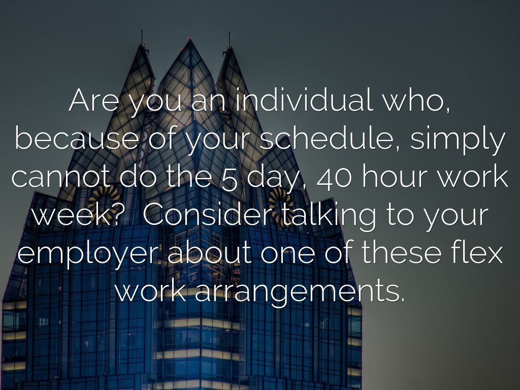 Are you an individual who, because of your schedule, simply cannot do the 5 day, 40 hour work week? Consider talking to your employer about one of these flex work arrangements.