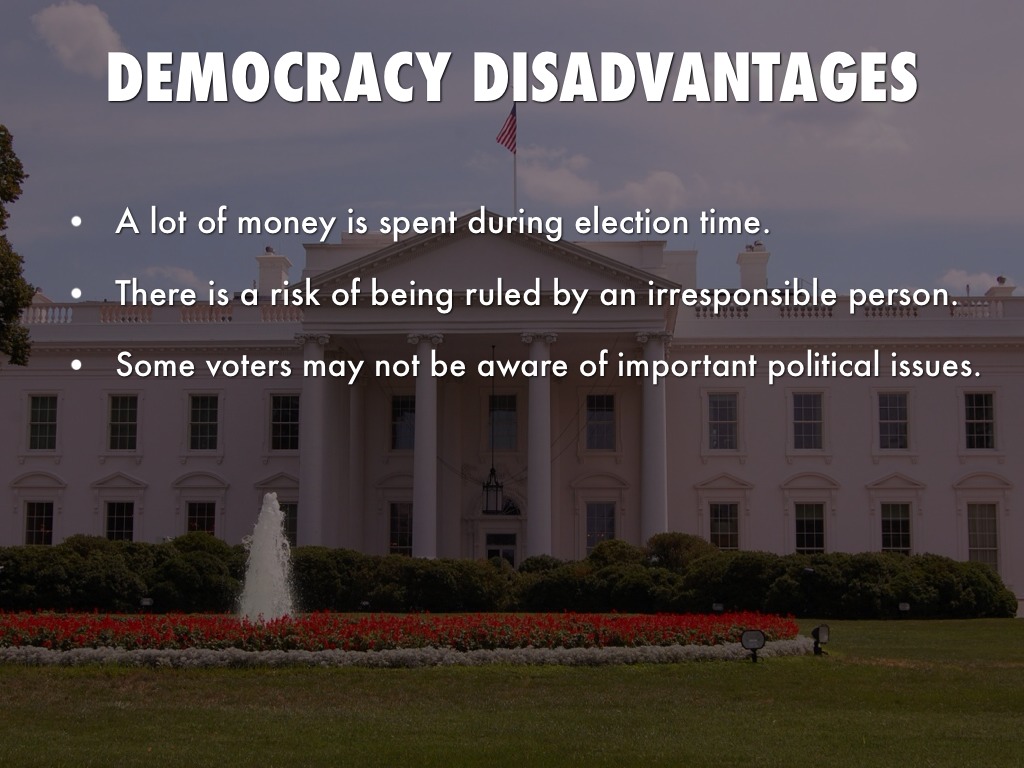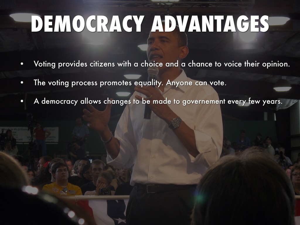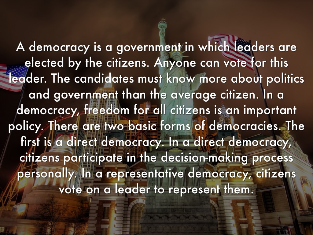A democracy is a government in which leaders are elected by the citizens. Anyone can vote for this leader. The candidates must know more about politics and government than the average citizen. In a democracy, freedom for all citizens is an important policy. There are two basic forms of democracies. The first is a direct democracy. In a direct democracy, citizens participate in the decision-making process personally. In a representative democracy, citizens vote on a leader to represent them.