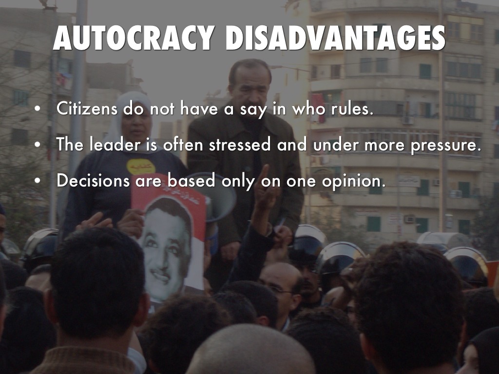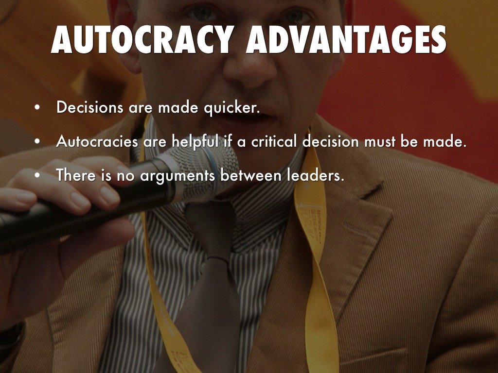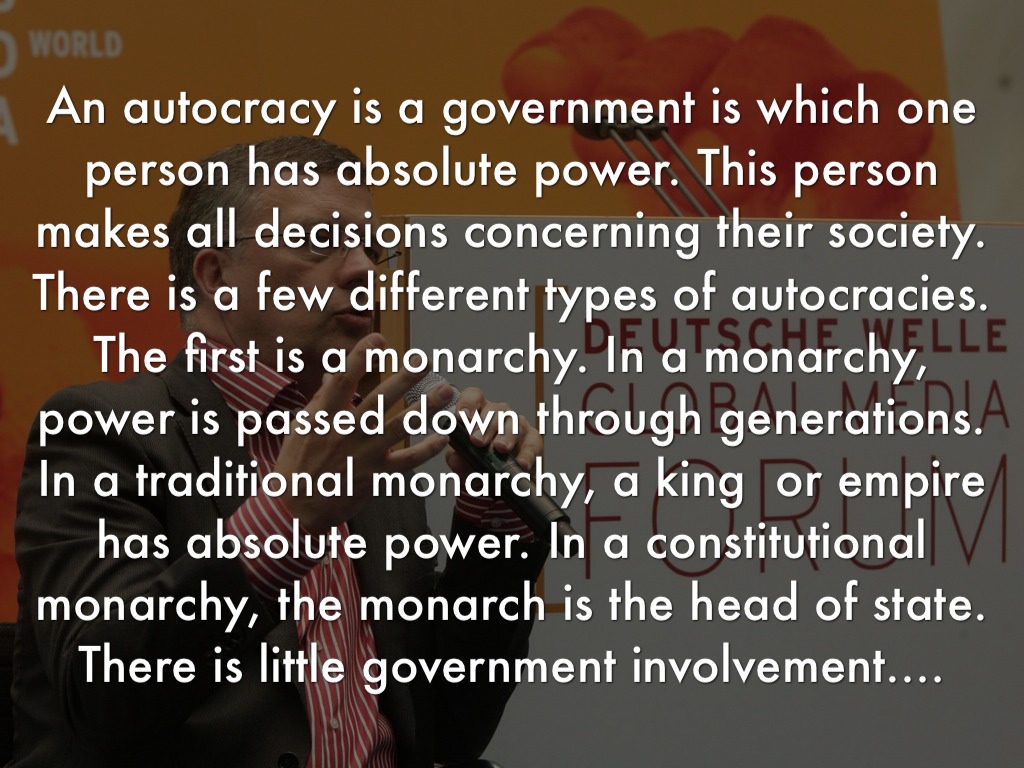 An autocracy is a government is which one person has absolute power. This person makes all decisions concerning their society. There is a few different types of autocracies. The first is a monarchy. In a monarchy, power is passed down through generations. In a traditional monarchy, a king or empire has absolute power. In a constitutional monarchy, the monarch is the head of state. There is little government involvement.