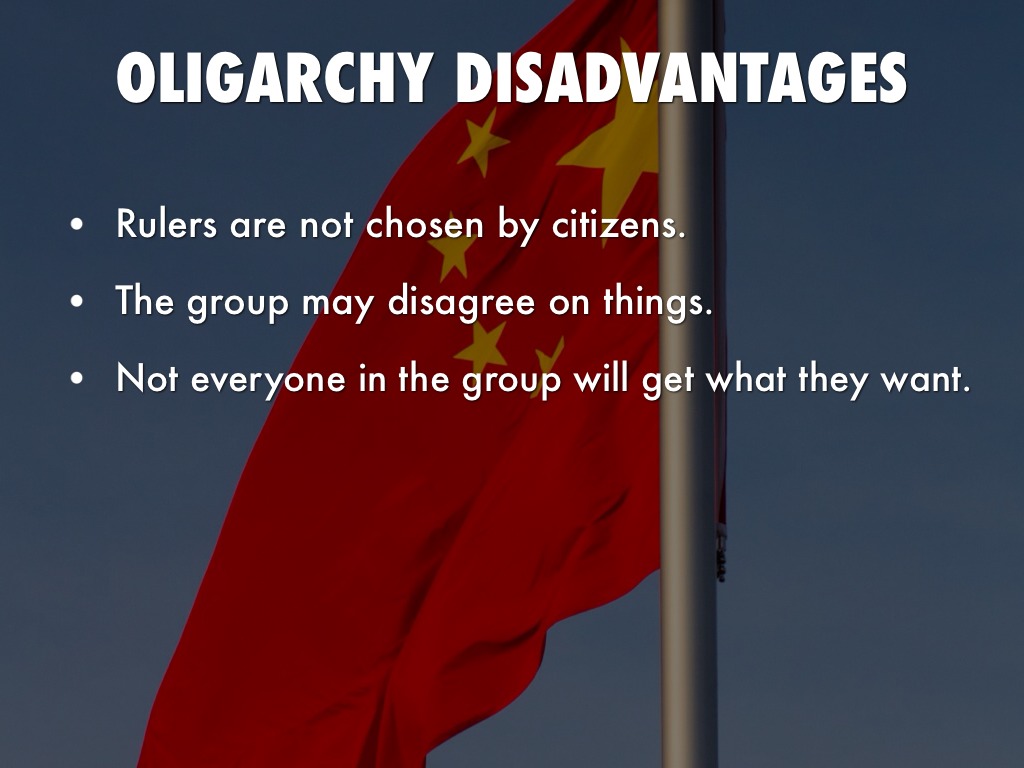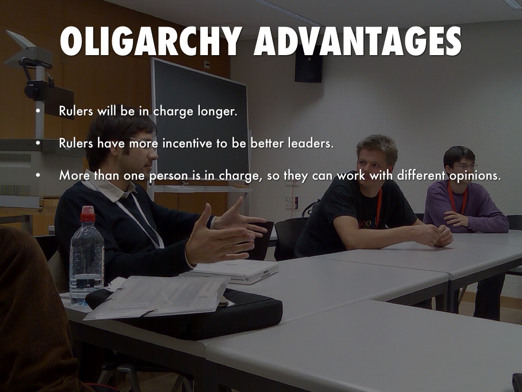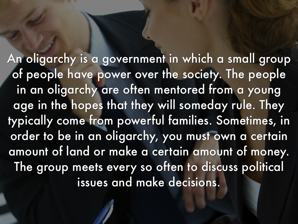 An oligarchy is a government in which a small group of people have power over the society. The people in an oligarchy are often mentored from a young age in the hopes that they will someday rule. They typically come from powerful families. Sometimes, in order to be in an oligarchy, you must own a certain amount of land or make a certain amount of money. The group meets every so often to discuss political issues and make decisions.