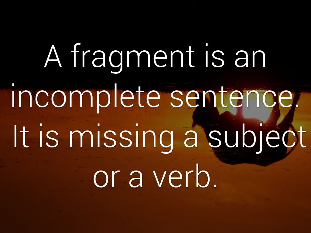 A fragment is an incomplete sentence. It is missing a subject or a verb.