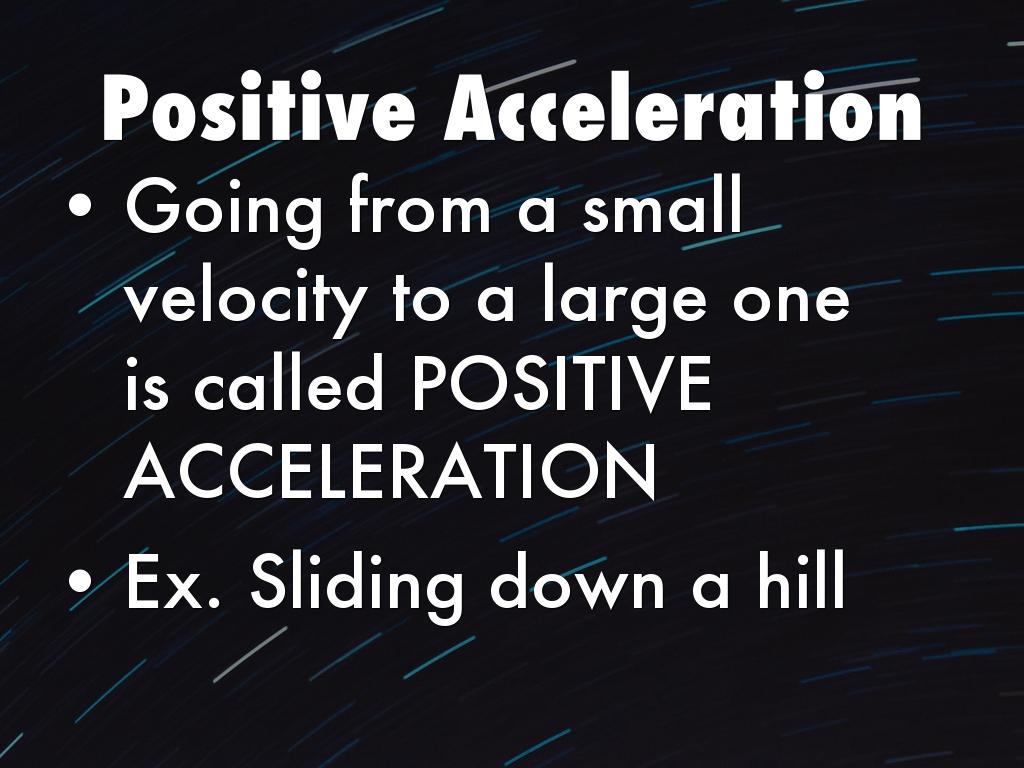 Going from a small velocity to a large one is called POSITIVE ACCELERATION
