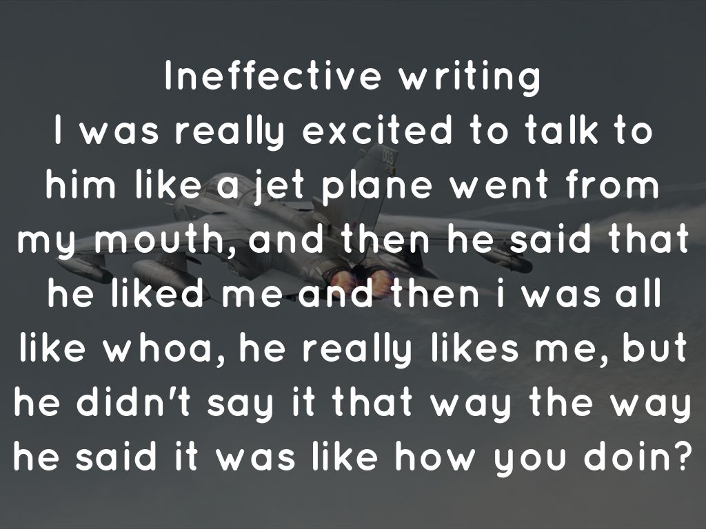 Ineffective writing I was really excited to talk to him like a jet plane went from my mouth, and then he said that he liked me and then i was all like whoa, he really likes me, but he didn't say it that way the way he said it was like how you doin?