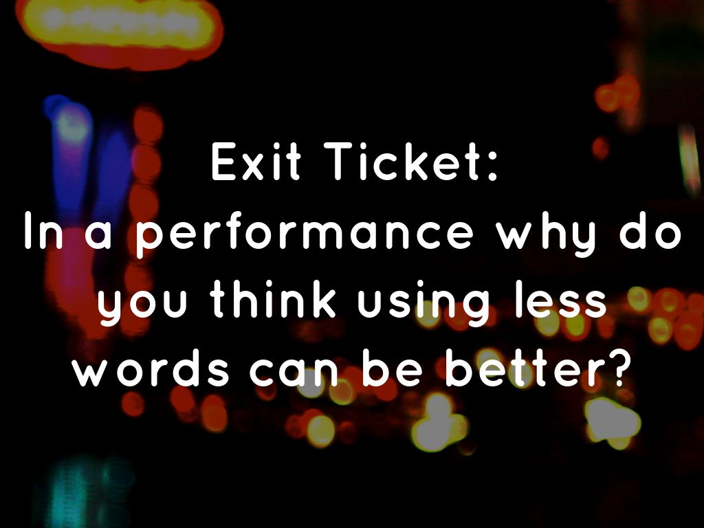 Students are prompted with "In a performance why do you think using less words can be better?" Start thinking about how performance relates with less words.