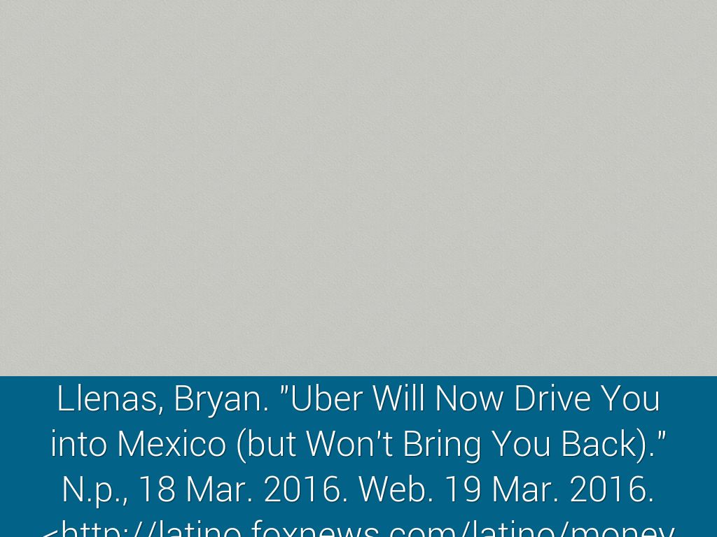 Llenas, Bryan. "Uber Will Now Drive You into Mexico (but Won't Bring You Back)." N.p., 18 Mar. 2016. Web. 19 Mar. 2016.