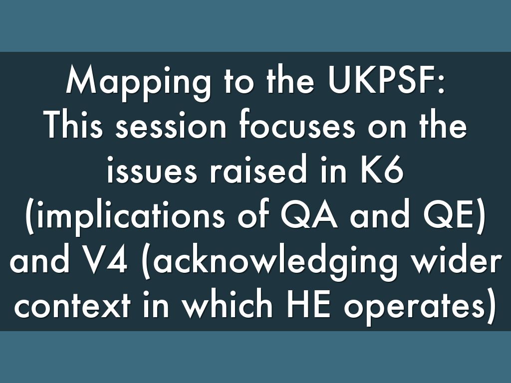 This session focuses on the issues raised in K6 (implications of QA and QE) and V4 (acknowledging wider context in which HE operates)