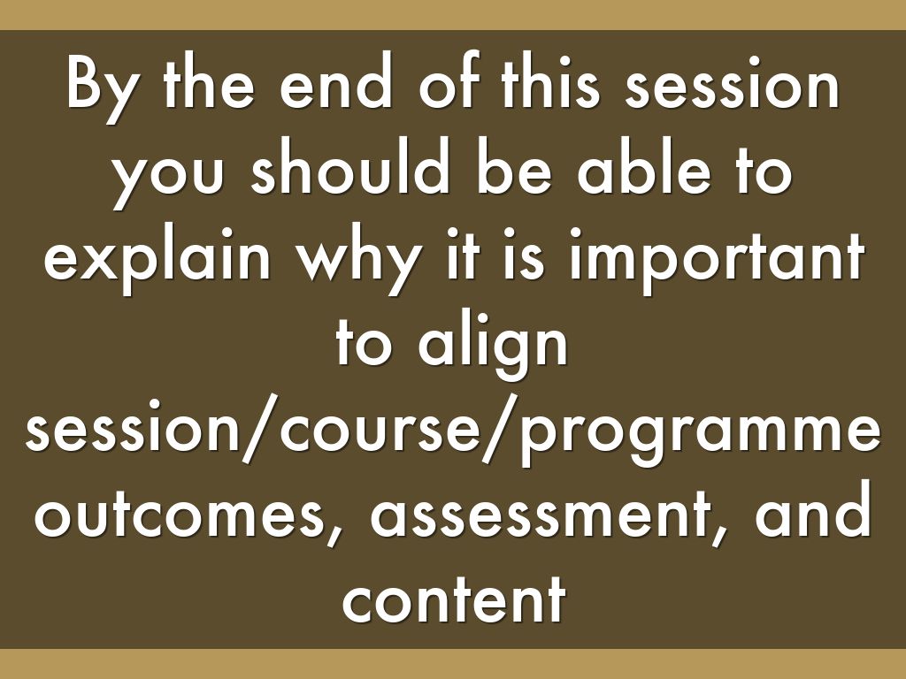By the end of this session you should be able to explain why it is important to align session/course/programme outcomes, assessment, and content