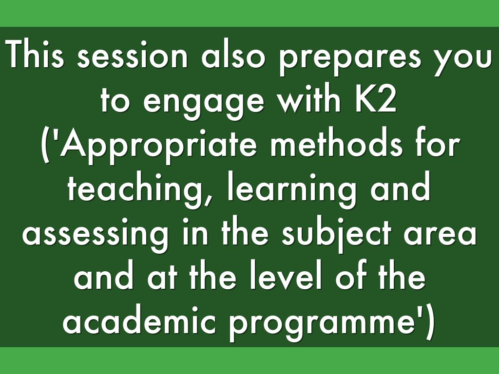 This session also prepares you to engage with K2 ('Appropriate methods for teaching, learning and assessing in the subject area and at the level of the academic programme')
